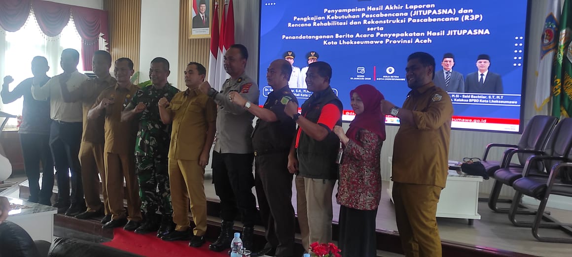 Acara pembahasan hasil akhir dari Laporan Pengkajian Kebutuhan Pasca Bencana (JITUPASNA) dan Rehabilitasi Pasca Bencana serta penandatanganan kesepakatan Berita Acara hasil JITUPASNA di Aula Setdako Lhokseumawe
